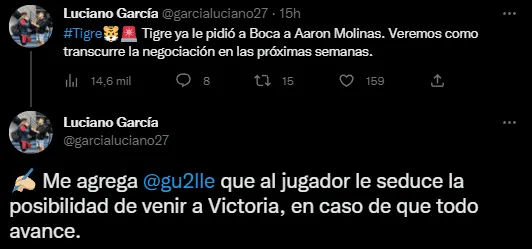 En este sentido, el periodista partidario de Tigre, Luciano García, expresó en su cuenta de Twitter que el Matador de Victoria ya le hizo un pedido formal a Boca por Aaron Molinas y que, en adición a esto, al enganche “le seduce” la posibilidad de llegar al equipo dirigido por Diego Martínez. De esta manera, solo quedaría que el Xeneize acepte la cesión del pibe de Lomas del Mirador, algo que no sería problema debido a que necesita tener minutos y en Brandsen 805 no los tendrá.
