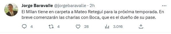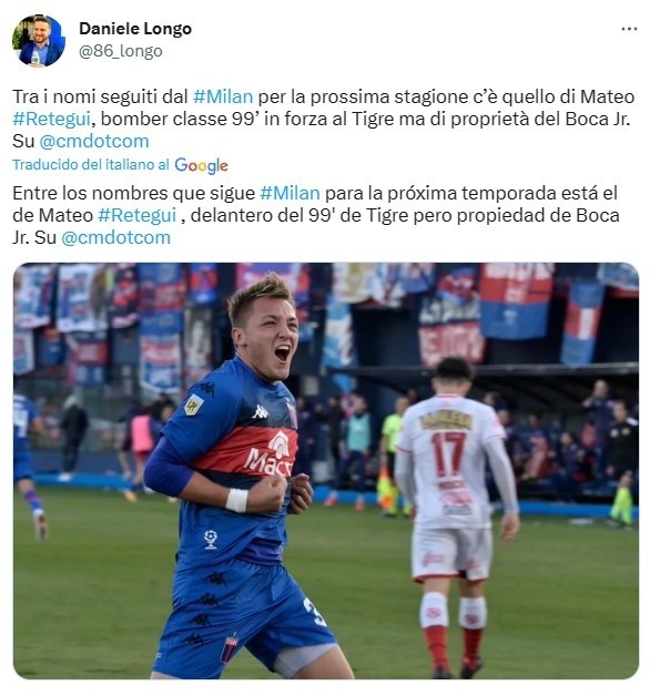 Según informóCalcioMercato,“entre los nombres que sigue el Milan para la próxima temporada está el de Mateo Retegui”, dejando en claro que el gigante italiano primero deberá negociar con Boca para resolver la operación.Transfermarkt, sitio especializado en valores de mercado, cotiza al delantero del Matador en ocho millones de euros. Sin embargo, se espera que una potencial venta supere ese monto.