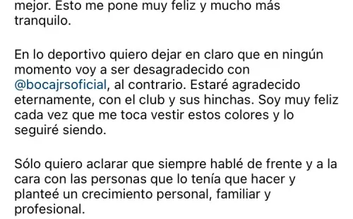 “A raíz de las distintas versiones relacionadas a mi salida del país, quiero expresar que fue por un tema familiar, la salud de mi madre en este caso quién hoy gracias a Dios, se encuentra cada día mejor. Esto me pone muy feliz y mucho más tranquilo”, escribió el jugador de Boca en redes sociales, ilustrando la publicación con una foto suya junto a su madre y dos médicos en una sala de hospital.