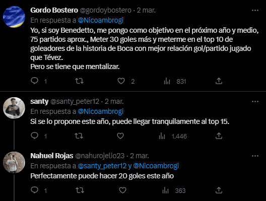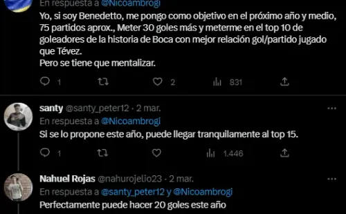 En concreto, y teniendo en cuenta que en la temporada pasada con un mal pasar e incluso perdiéndose varios partidos por lesión llegó a anotar 16 goles, incitaron a Benedetto a llegar a meterse para fines de año en el top 15 de máximos goleadores. Para ello, deberá convertir 18 tantos más durante el 2023 como mínimo.