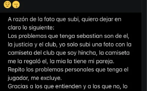 Claro está que esta catarata de repudio que cayó sobre Yamila le llegó a la propia jugadora y horas después del hecho, decidió hacer un comunicado aunque siguiendo con la polémica. En su cuenta de Twitter escribió: “A razón de la foto que subí, quiero dejar en claro lo siguiente: los problemas que tenga Sebastián (Villa) son de él, de la justicia y del club, yo solo subí una foto con la camiseta del club que soy hincha, la camiseta me la regaló él y la mía la tiene mi pareja. Repito, los problemas personales que tenga el jugador me exluyen. Gracias a los que entienden y a los que no, lo siento. Buenas noches y aguante Boca!“, cerró en el comunicado junto a unos emojis sugerentes.