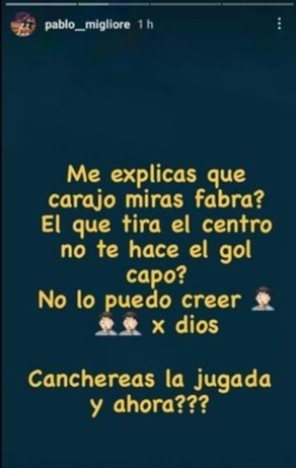 En su historia de Instagram posteó: “¿Me explicás que carajo mirás Fabra? ¿El que tira el centro no te hace el gol capo? No lo puedo creer por dios“, re caliente contra el colombiano, donde lo liquidó diciendo: “Cancheareás la jugada, ¿y ahora?“.