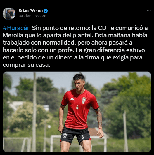 El periodista Brian Pécora confirmó esta cuestión en sus redes: “La CD le comunicó a Merolla que lo aparta del plantel. Esta mañana (sábado) había trabajado con normalidad, pero ahora pasará a hacerlo solo con un profe. La gran diferencia estuvo en el pedido de un dinero a la firma que exigía para comprar su casa.Desde la dirigencia aseguran que el esfuerzo contractual era muy grande y también se contemplaba esa necesidad personal del jugador. Desde el entorno de Merolla indican que no conformaban los plazos de esos pagos. No renovará su contrato con Huracán“. Mientras Letonia o su salida como agente libre parecen sus opciones más reales, si Boca mueve rápido los hilos necesarios, podría quedarse con su tan esperado defensor zurdo.