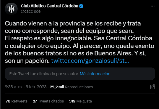 El jornalista borró su tuit en donde informaba de esta situación pero la cuenta oficial del Ferroviario lo vio y añadió la postura del club santiagueño en el asunto. “Cuando vienen a la provincia (Stgo del Estero) se los recibe y trata como corresponde, sean del equipo que sean. El respeto es algo innegociable. Sea Central Córdoba o cualquier otro equipo. Al parecer, uno queda exento de los buenos tratos si no es de Buenos Aires. Y si, son un papelón“, expresaron desde el Central Córdoba.