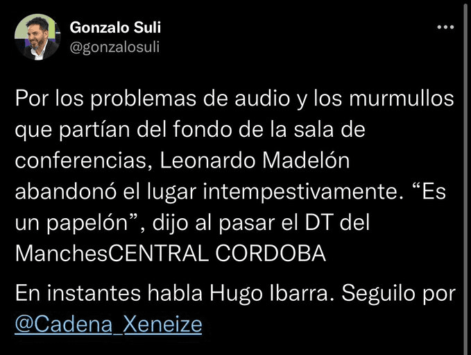 Luego del encuentro entre ambos, correspondía que los dos entrenadores asistieran a la sala de prensa local y visitante respectivamente, y allí se dio una situación insólita que generó indignación en la parcialidad santiagueña. En concreto, el periodista Gonzalo Suli confesó que hubo problemas en el audio de Leonardo Madelón para su conferencia y que además, se sintieron murmullos desde el fondo de la sala. Esto generó enojo de parte del entrenador de Central Córdoba, quien luego abandonó el recinto exclamando que esto “era un papelón“.
