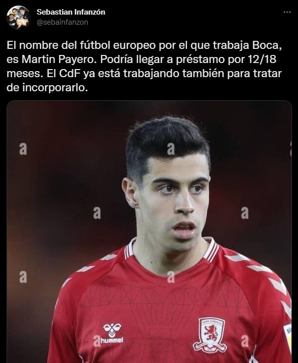 El periodista partidario Sebastián Infanzón reveló en su cuenta de Twitter que el apuntado es Martín Payero. “El nombre del fútbol europeo por el que trabaja Boca es Martin Payero. Podría llegar a préstamo por 12/18 meses. El consejo de fútbol ya está trabajando también para tratar de incorporarlo”, escribió.