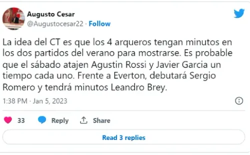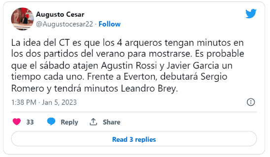 “Es probable que el sábado atajen Agustin Rossi y Javier Garcia un tiempo cada uno. Frente a Everton (13/1), debutará Sergio Romero y tendrá minutos Leandro Brey”, agregó el periodista. De esta manera, se pateará el estreno del ex arquero de la Selección Argentina.