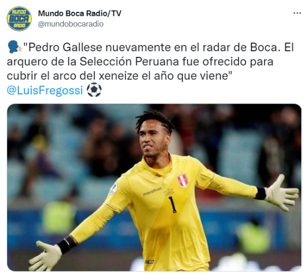 No obstante, la clasificación a la Libertadores le podría significar al Xeneize una importante inyección de dinero para salir a comprar futbolistas de jerarquía e intentar quedarse con el campeonato. La primera figura ya empezó a sonar para 2022 y se trata de un ofrecimiento que llegó en estas horas a las oficinas del Consejo de Fútbol: Pedro Gallese, arquero de la Selección de Perú, fue acercado a la institución azul y oro según informó el periodista Luis Fregossi en Mundo Boca.