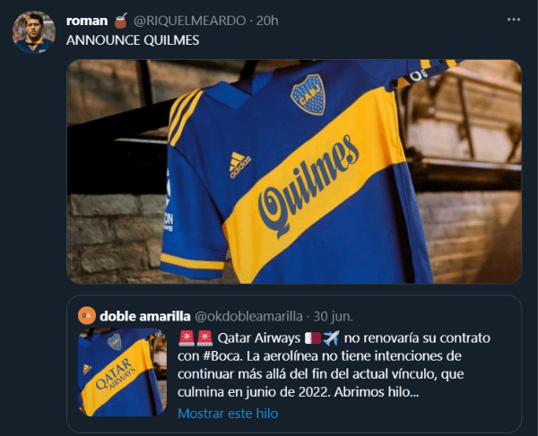 Mientras tanto, en las redes sociales comenzó a circular una imagen que no demoró en hacerse viral. En la misma se puede ver la camiseta de Boca actual pero con el logo de “Quilmes” en el pecho. Lo cierto es que recibió una aprobación masiva por parte de prácticamente todos los hinchas del equipo Xeneize, a quienes les gustó la idea.