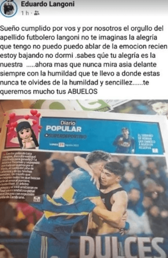 “Sueño cumplido por vos y por nosotros. El orgullo del apellido futbolero Langoni.No te imaginas la alegría que tengo, no puedo hablar de la emoción. Recién estoy bajando. No dormí. Sabés que tu alegría es la nuestra. Ahora más que nunca. Mirá hacia delante, siempre con la humildad que te llevó a donde estás.Nunca te olvides de la humildad y sencillez. Te queremos mucho. Tus abuelos”, escribió Eduardo, junto a la imagen de la tapa del diario Popular.