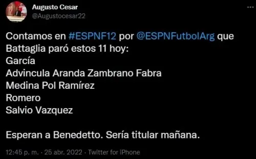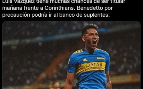 El periodista Ignacio Bezruk informó: “Luís Vázquez tiene muchas chances de ser titular mañana frente a Corinthians. Benedetto por precaución podría ir al banco de suplentes”. El “Pipa” fue reemplazado por Vázquez ante Central Córdoba por un calambre y dijo que estaba bien, pero esta mañana no formó parte del ensayo.