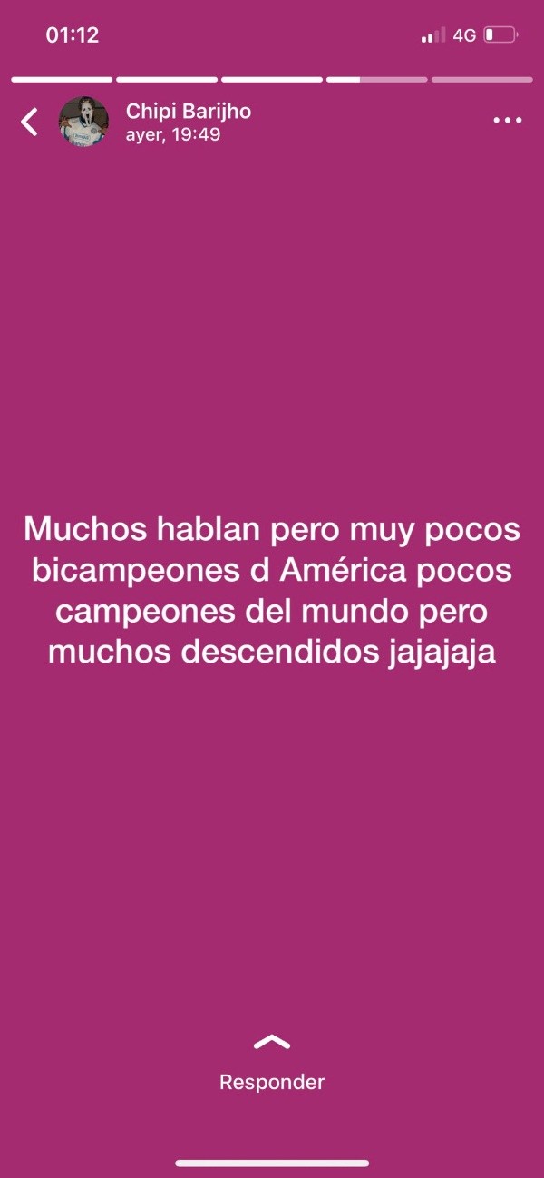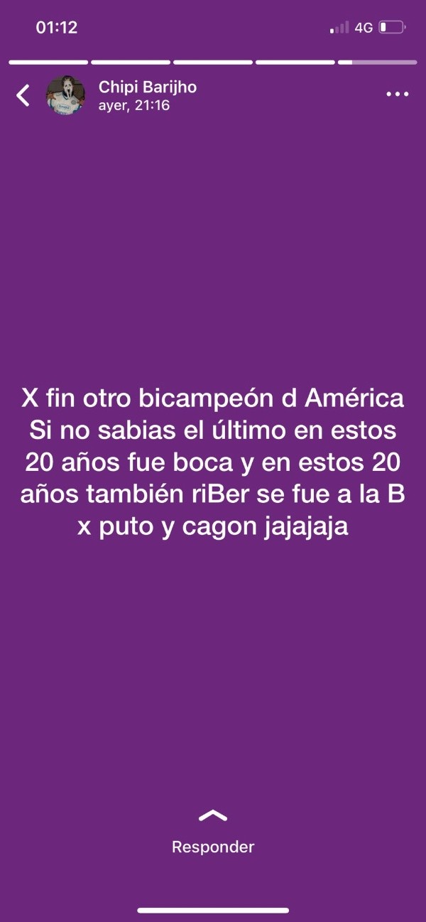 “Por fin otro bicampeón de América. Si no sabías, el último en estos 20 años fue Boca. Y en estos 20 años también River se fue a la B por p… y cagón jajajaja”, escribió el “Chipi” en los estados de Whatsapp. Y la captura llegó a las redes sociales.