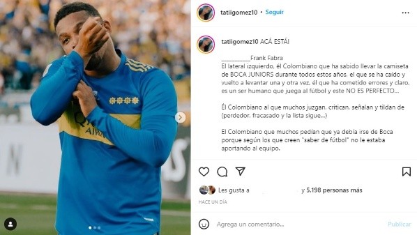 “El lateral izquierdo, el colombiano que ha sabido llevar la camiseta de Boca Juniors durante todos estos años. El que se ha caído y vuelto a levantar una y otra vez. El que ha cometido errores… Y, claro, es un ser humano que juega al fútbol y este no es perfecto”, mencionó Tatiana. “El colombiano al que muchos juzgan, critican, señalan y tildan de perdedor, fracasado y la lista sigue… El colombiano que muchos pedían que ya debía irse de Boca porque según los que creen ‘saber de fútbol’ no le estaba aportando al equipo“, agregó.