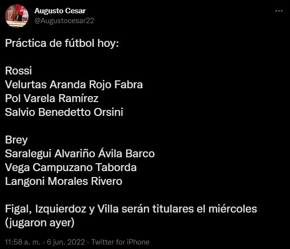 El equipo que paró el entrenador este lunes fue: Agustín Rossi; Pedro Velurtas, Gabriel Aranda, Marcos Rojo, Frank Fabra; Guillermo “Pol” Fernández, Alan Varela, Juan Ramírez, Eduardo Salvio, Darío Benedetto y Nicolás Orsini. Nicolás Figal, Carlos Izquierdoz y Sebastián Villa no participaron porque jugaron contra Arsenal pero serán titulares.