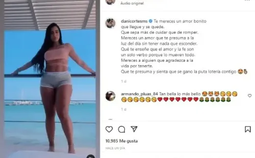 “Te mereces un amor bonito que llegue y se quede. Que sepa más de cuidar que de romper. Mereces un amor que te presuma a la luz del día sin tener nada que esconder. Que te enseñe que el amor y la fe son un solo verbo porque lo mueven todo. Mereces a alguien que agradezca a la vida por tenerte. Que te presuma y sienta que se ganó la puta lotería contigo”, fue el texto que publicó Daniela.