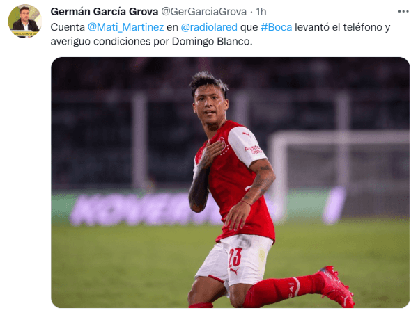 Según informó el periodista de Independiente en Radio La Red, Matías Martínez, Boca apuntó sus cañones al mediocampista interno Domingo Blanco. La situación contractual del ex Defensa y Justicia llama la atención de cualquier equipo, ya que no renovó su vínculo con el Rojo y se marchará con el pase en su poder después del 30 de junio.