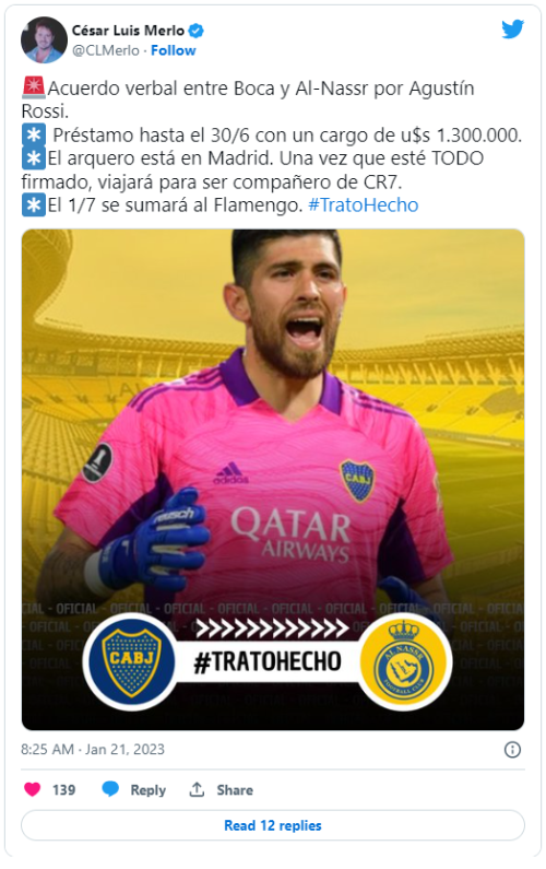 Luego de tantas idas y vueltas, la historia de Agustín Rossi con e llegó a su fin. La firma del arquero para atajar en Flamengo a partir del 30 de junio no gustó ni un poco en el club y es por eso que Hugo Ibarra decidió que no atajara más hasta su salida. Luego de una negociación relámpago, el Xeneize acordó con un préstamo al Al-Nassr de Cristiano Ronaldo.