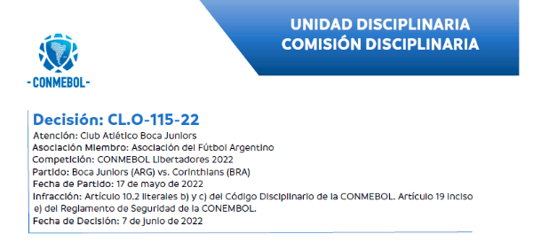 Varios clubes argentinos ya habían recibido sanciones de Conmebol y ahora fue el turno de Boca. Este viernes, el Xeneize fue notificado de un castigo de parte de la confederación sudamericana, por un hecho sucedido el 17 de mayo de este año en el partido frente a Corinthians en La Bombonera, por la Copa Libertadores.