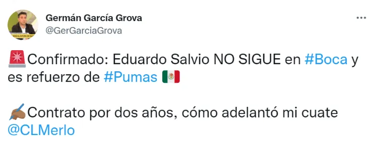 A pesar de que iba a mantener una reunión con los dirigentes y los miembros del Consejo de Fútbol, según informó el periodista de TyC Sports, Germán García Grova, Eduardo Salvio no continuará en Boca y se marchará a Pumas UNAM.