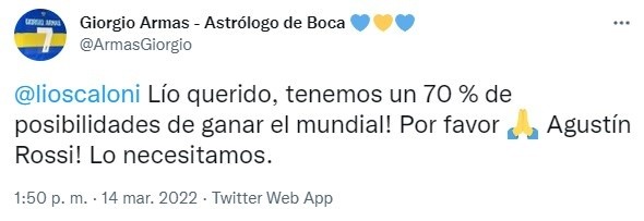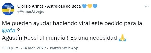 Giorgio Armas, reconocido tarotista en Twitter, le escribió al DT: “Lio querido, ¡tenemos un 70% de posibilidades de ganar el Mundial! Por favor, Agustín Rossi! Lo necesitamos”. Y luego publicó otro tuit: “¿Me pueden ayudar haciendo viral este pedido para la AFA? Agustín Rossi al mundial! Es una necesidad”.
