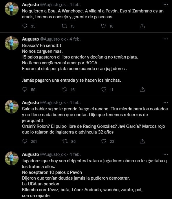 A través de Twitter, un exdirigente le respondió con todo. Augusto Di Giovanni, exvicepresidente del departamento de marketin, señaló: “Jugadores que hoy son dirigentes tratan a jugadores cómo no les gustaba que los traten a ellos. No aceptaron 10 palos por Pavón. Dijeron que tenían deudas jamás la pudieron demostrar. La UBA, un papelón. Kilombo con Tevez, Buffarini, López, Andrada, Wanchope, Zárate, Pol… Son un rejunte”.