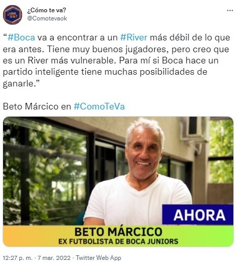 Además, en “¿Cómo te va?”, el ídolo dejó un mensaje esperanzador. “Boca va a encontrar a un River más débil de lo que era antes. Tiene muy buenos jugadores, pero creo que es un River más vulnerable. Para mí si Boca hace un partido inteligente tiene muchas posibilidades de ganarle”, aseguró.