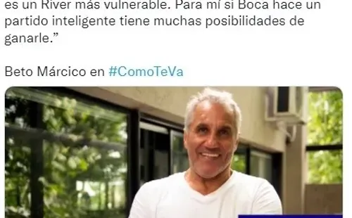 Alberto Márcico quiso aportar lo suyo y transmistió su idea: “Que no juegue como jugó los últimos partidos. Boca tiene que ser protagonista e ir al frente”. En una charla con TyC Sports, explicó: “A River de igual a igual no le podés jugar porque tiene un ritmo infernal, pero le podés jugar a como juega Boca, bien agrupaditos y cuando tenés la pelota atacas”.