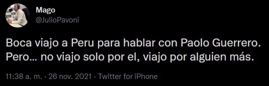 El periodista partidario Julio Pavoni lo contó a través de su cuenta de Twitter. “Boca viajo a Peru para hablar con Paolo Guerrero. Pero… No viajo solo por el, viajo por alguien más”, escribió. Y luego subió la foto de un pájaro.