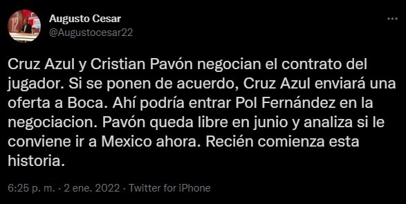 El periodista Augusto César contó que Cristian Pavón aún no definió qué hara con la posibilidad de irse a México debido a este dilema que atraviesa. “Cruz Azul y Cristian Pavón negocian el contrato del jugador. Si se ponen de acuerdo, Cruz Azul enviará una oferta a Boca. Ahí podría entrar Pol Fernández en la negociacion. Pavón queda libre en junio y analiza si le conviene ir a Mexico ahora. Recién comienza esta historia”, explicó.