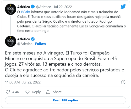 Se trata de Antonio Mohamed, quien acaba de ser despedido de Atlético Mineiro tras el empate de su equipo ante Cuiabá. Pese a haber metido a su club en los cuartos de final de la Copa Libertadores (enfrentará a Palmeiras en unos días), el Turco venía en la cuerda floja y se quedó sin trabajo esta mañana. Ahora está libre…