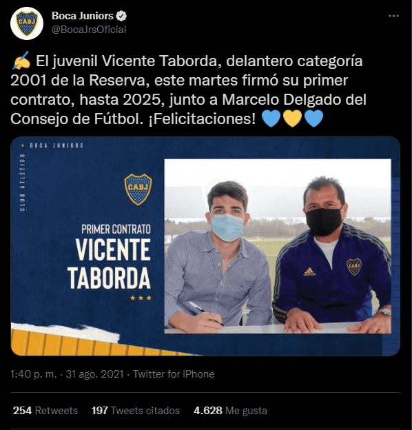 Ese premio no fue ni más ni menos que la firma de su primer contrato profesional. Acompañado de Marcelo Delgado, integrante del Consejo del Fútbol, el juvenil puso el gancho en la hoja y selló un vínculo oficial con Boca hasta 2025.