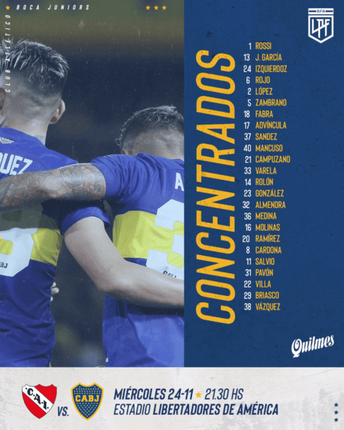 Agustín Rossi; Luis Advíncula, Lisandro López, Carlos Izquierdoz, Agustín Sández; Cristian Medina, Alan Varela, Agustín Almendra; Eduardo Salvio, Norberto Briasco y Cristian Pavón.