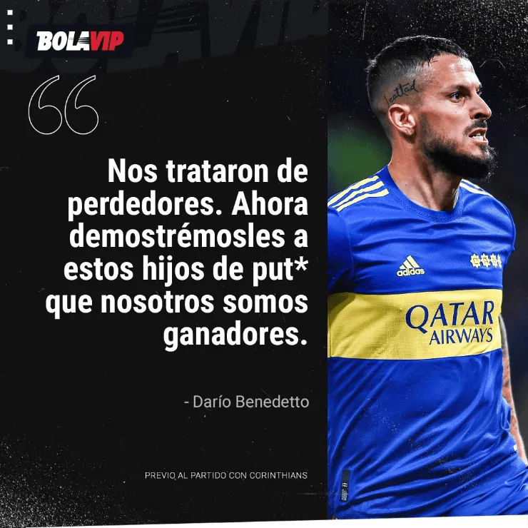 “Allá nos trataron de perdedores, demostrémosles a estos hijos de p*ta que somos ganadores”, fue lo que soltó Benedetto al resto de los futbolistas de Boca antes de saltar a la cancha. Luego, casi de manera automática, el once completo del Xeneize subió las escaleras y se dispuso a comenzar los 90 minutos del partido clave que define el pase a cuartos de la Libertadores ante el Timao. Tras finalizar los primeros 45 minutos, el Pipa no pudo convertir el gol de Boca al errar un penal.