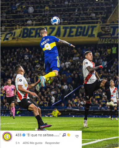Esta acción en específico llegó incluso a medios internacionales como la reconocida cuenta 433, la cual cuenta con casi 50 millones de seguidores en Instagram. Escribiendo primero “Aerolíneas Pipa Benedetto“, en inglés, luego la cuenta aprovechó la oleada de hinchas de Boca que entraron a la publicación para chicanear a River con el descenso a la B Nacional, poniendo como comentario en la foto “El que no saltaaa..“, haciendo referencia a la canción de Boca dedicada a su eterno rival.