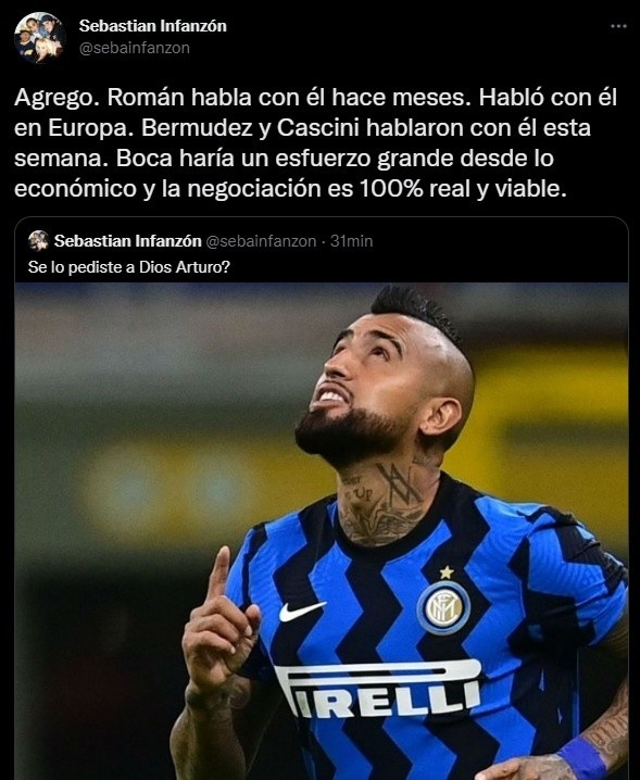 “Me cuentan que en Boca estaban rezando que esto no saliera en los medios. Con respecto a Arturo Vidal, tiene contrato por un año más con el Inter. Pero gana tanto, que no va a haber problema para que le paguen una cifra menor y se vaya con el pase en su poder. Eso es un camino allanado para el que lo quiere”, mencionó el periodista. Y agregó: “Su salida del Inter la tiene arreglada. El otro equipo que lo quiere es el Flamengo, pero andan a los tiros. Cambiaron el técnico…”.