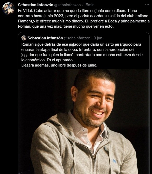 Por su parte, el periodista partidario Sebastián Infanzón dio algunos detalles más sobre la situación de Vidal y las intenciones del consejo de fútbol. “Román habla con él hace meses. Habló con él en Europa. Bermúdez y Cascini hablaron con él esta semana. Boca haría un esfuerzo grande desde lo económico y la negociación es 100% real y viable”, indicó.
