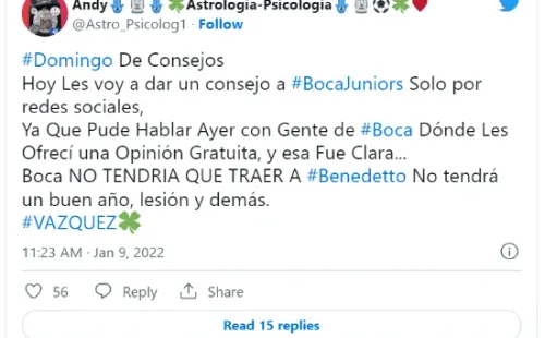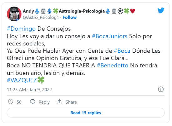 “Hoy le voy a dar un consejo aBoca Juniors solo por redes sociales, ya que pude hablar ayer con gente de Boca. Les ofrecí una opinión gratuitay esa fue clara: Boca NO TENDRIA QUE TRAER A Benedetto. No tendrá un buen año. Lesión y demás…”, había tuiteado cuando todavía no estaba cerrado el pase desde el Elche.