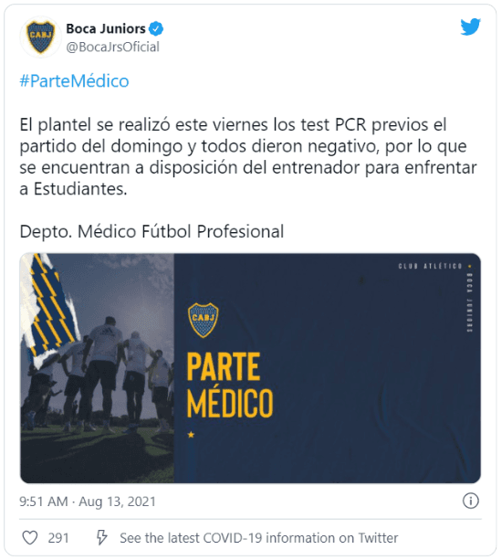 “El plantel se realizó este viernes los test PCR previos el partido del domingo y todos dieron negativo, por lo que se encuentran a disposición del entrenador para enfrentar a Estudiantes”, comunicaron desde el Departamento Médico del club de la Ribera.