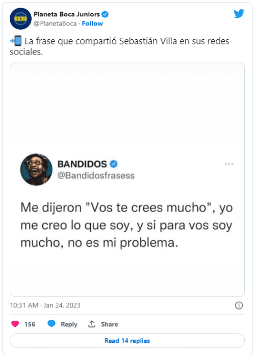 “Me dijeron ‘Vos te crees mucho’. yo me creo lo que soy, y si para vos soy mucho, no es mi problema”, posteó el colombiano en su cuenta de Instagram. Si bien no hay una referencia explícita sobre algo que tenga que ver con algo interno de Boca, a los hinchas del Xeneize no les gustó mucho.