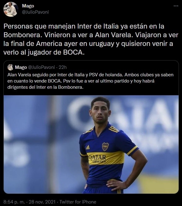 Así lo contó Julio Pavoni, periodista partidario del Xeneize, en su cuenta de Twitter. “Alan Varela, seguido por Inter de Italia y PSV de holanda. Ambos clubes ya saben en cuánto lo vende Boca. PSV lo fue a ver al último partido y hoy habrá dirigentes del Inter en La Bombonera”, reveló durante la tarde del domingo.