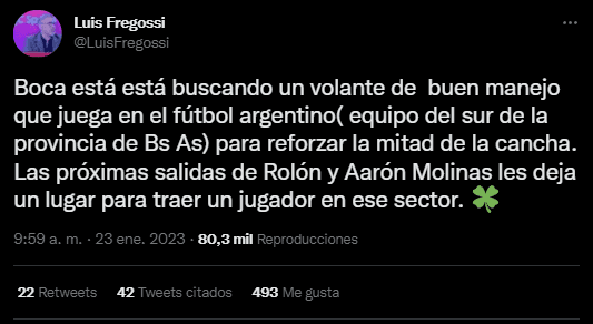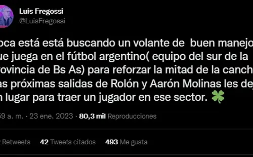 En este sentido, el periodista Luis Fregossi confirmó que hay un tapado para este puesto. Según el jornalista, Boca busca un “volante de buen pie” que milita las filas de un equipo del Sur del Gran Buenos Aires, ya que las salidas a préstamo de Aaron Molinas y Esteban Rolón dejan vacantes para este sector.