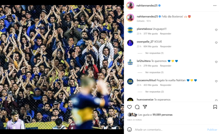 Se trata de Nahitan Nández. El uruguayo, actualmente en el Cagliari de la Serie B de Italia, hizo un posteo del día de su último partido en el club deseándole un gran día a los hinchas de Boca. “Volvé”, fue el comentario casi unánime que hicieron todos los simpatizantes.
