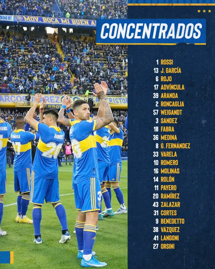 Para el mismo, el cual se disputará a las 19 horas en La Bombonera, ya se conocieron a los futbolistas convocados del equipo que será local, y en dicha lista hubo alguna que otra sorpresa. Para empezar, luego de la polémica con la baja de la sanción, vuelve a aparecer Marcos Rojo tras cumplir la fecha de suspensión por la patada a Nicolás De La Cruz en el Superclásico. Otro que vuelve a figurar entre los concentrados es el juvenil zaguero Gabriel Aranda, quien se metió debido a que Nicolás Figal y Carlos Zambrano no estarán presentes por distintos motivos.