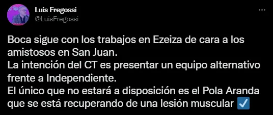 En concreto, el periodista Luis Fregossi informó que Gabriel Aranda padece una lesión muscular y se está recuperando de la misma, por lo que no formó parte de las prácticas de este miércoles en lapretemporada. Asímismo, el jornalista confirmó que ya empezaron los preparativos para el amistoso en San Juan de este sábado 7 de enero ante Independiente, en donde Hugo Ibarra pretende utilizar un equipo alternativo.