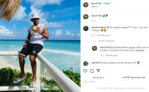 En las redes sociales, mientras tanto, Benedetto ya bromea con el resto de los jugadores. Frank Fabra subió una foto a su cuenta de Instagram el domingo por la noche en la que se lo ve en la playa y tomando de un coco. “¿Tan rápido llegaste? Si te vi hoy a la mañana”, le preguntó el “Pipa”. “Jajaja nada que un jet privado no pueda solucionar, pipón jajajajaja”, le respondió el lateral.