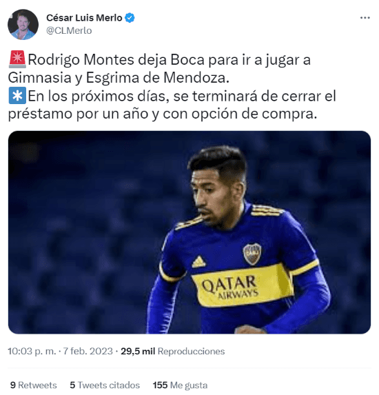 Se trata de Rodrigo Montes, mediocampista que supo ser varias veces titular con Sebastián Battaglia y hasta convirtió un gol con la camiseta azul y oro (a Atlético Tucumán en 2021). Según informó César Luis Merlo, el volante continuará su carrera en Gimnasia y Esgrima de Mendoza a préstamocon opción de compra.