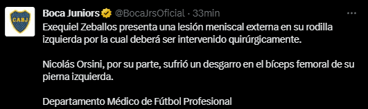 Con un tiempo aproximado de recuperación de un mes, Boca no podrá contar durante ese lapso con el Changuito justamente en una de las posiciones más flojas del plantel, ya que la delantera es donde más está sufriendo el Xeneize. Con la suspensión de Sebastián Villa, Zeballos se perfilaba como titular el próximo domingo ante Platense. Ahora, su regreso a las canchas tendrá que hacerse esperar.
