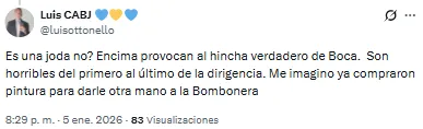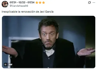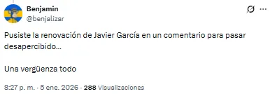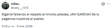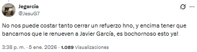 “No nos puede costar tanto cerrar un refuerzo, y encima tener que bancarnos que le renueven a Javier García. Es bochornoso esto ya”, lanzó uno de los hinchas. Otro, en cambio, decidió ir por el camino del sarcasmo: “¡Ah, bueno! Ahora sí, súbanse que vamos por la séptima”.