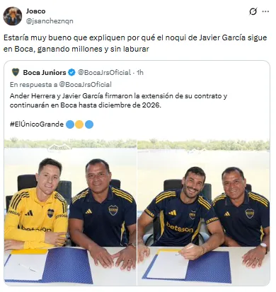Este lunes, Boca oficializó la extensión de un puñado de contratos en el plantel profesional. Futbolistas como Ander Herrera, Milton Delgado, Lautaro Di Lollo, Leandro Brey y Lautaro Blanco estiraron sus estadías en el Xeneize, pero la que no pasó desapercibida fue la de Javier García.