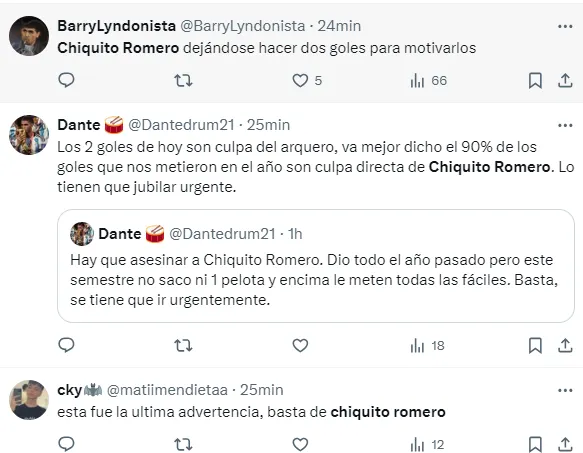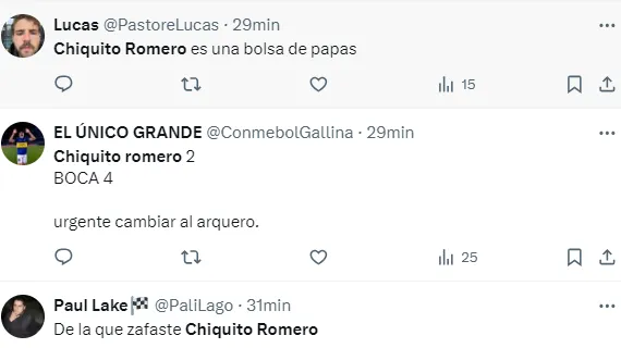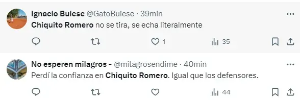 “Chiquito Romero, ciclo re contra cumplido”, “Que mal ataja Chiquito Romero”, “Basta de Chiquito Romero”, “Chiquito Romero es una bolsa de papas”, “Perdí la confianza en Chiquito Romero”, “Que rescinda en el vestuario”, “Se le terminó el veranito”, fueron algunos de los comentarios de los hinchas sobre el rendimiento del golero.